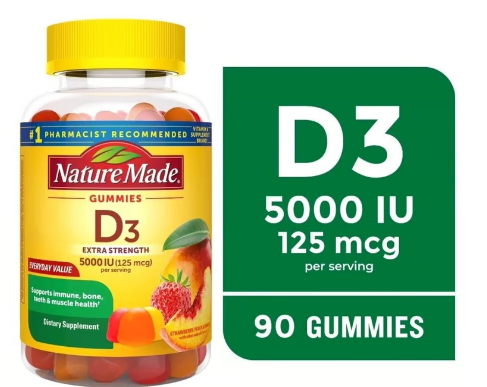 Suplemento para el apoyo del sistema inmunológico, músculos, dientes y salud ósea: contiene una botella de 90 unidades de Nature Made Extra Strength Vitamin D3 Supplement 5000 IU (125 mcg) por porción Gummies para un suministro de 45 días